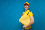courier in a yellow uniform holds a fabric eco bag and smiles, a delivery guy with a non-plastic bag