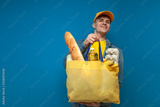 guy in a yellow cap holds a fabric eco bag full of food and smiles on a blue background, a buyer with a non-plastic bag