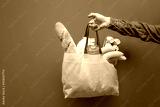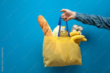 fabric eco bag full of food holds a guy's hand on a blue background, food delivery concept, plastic rejection concept