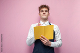 guy waiter in an apron takes an order and writes in a notebook, restaurant worker in uniform on pink background
