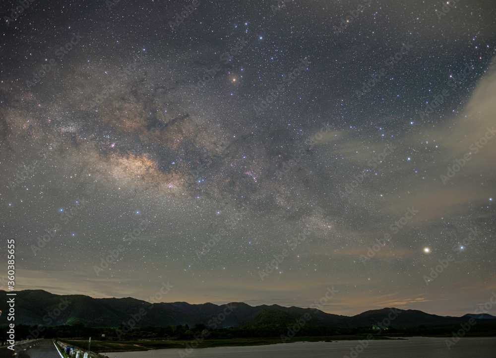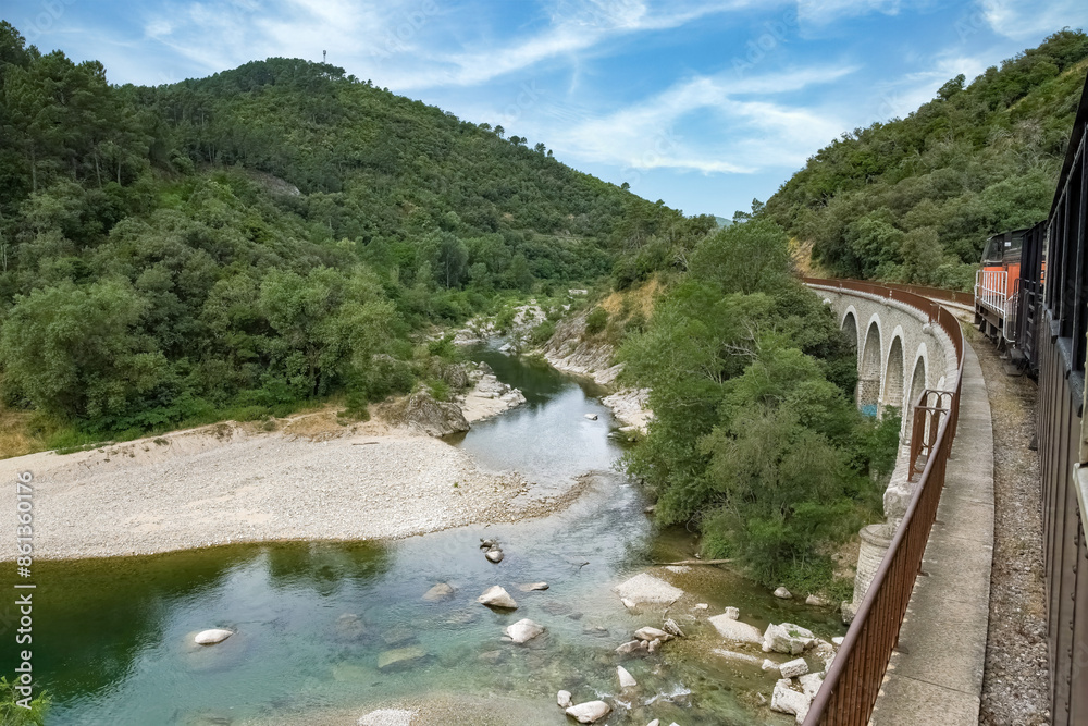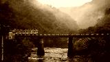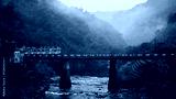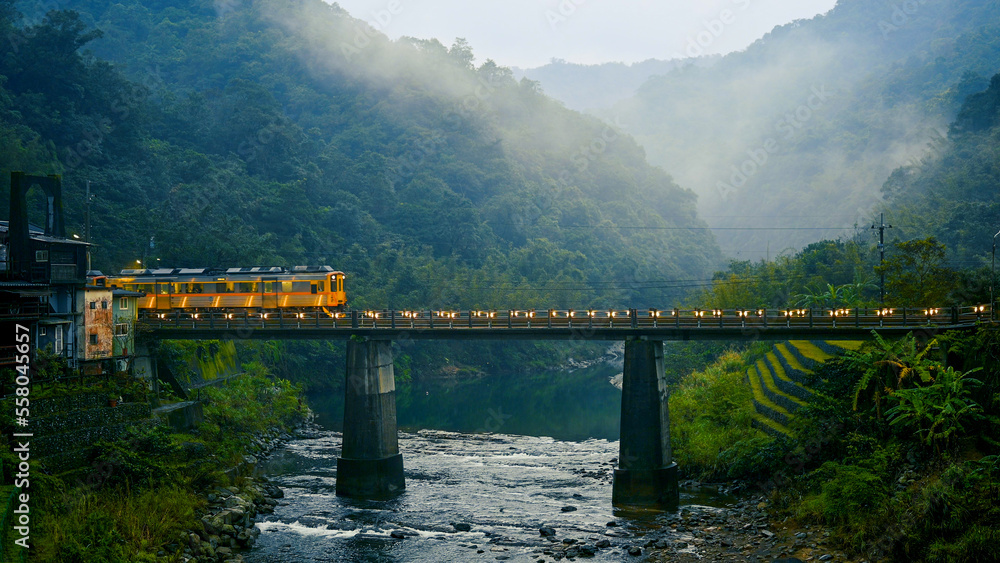 Trains pass over the bridge. The station next to a stream in a foggy valley. Sandiaoling Railway Station, Ruifang District, New Taipei City, Taiwan