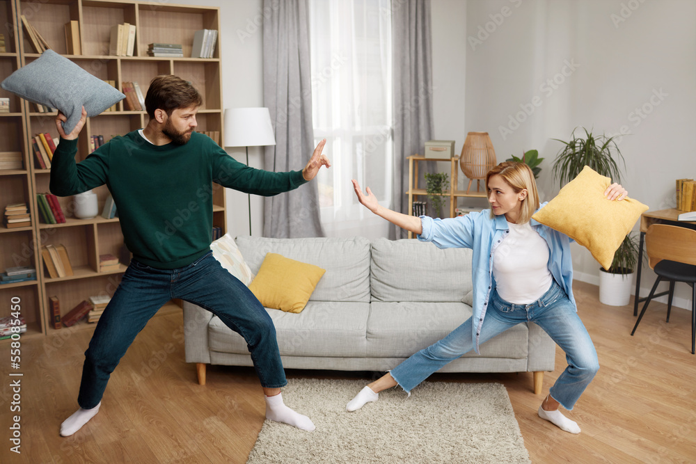 Couple Fighting Pillows At Home. Happy Young Couple Fighting On Pillows In Living Room. Positive Family Having Fun Together
