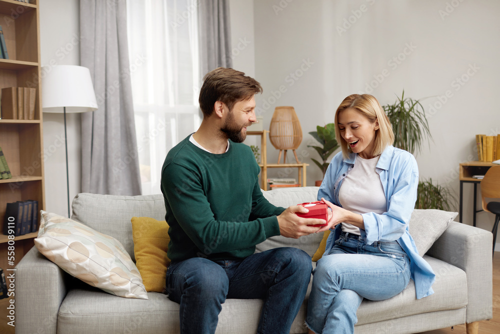Happy Man Presenting Gift To Wife. Excited Young Man Presenting Good Unexpected Present To Wife At Home. Loving Boyfriend Making Romantic Surprise To Girlfriend
