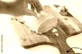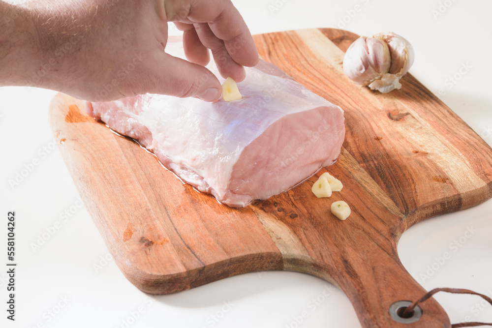 Garlic cloves for stuffed fresh pork for a piece. White table, wooden cutting board. Head of garlic and wooden manual pepper shaker.
