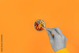Hand picking pickled mussels out of the can with toothpick. Orange background. pop art style