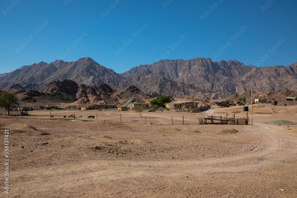 Beautiful stone mountains in the desert. Yellow sand on the mountains. Evening nature. Sunny summer day.