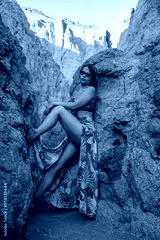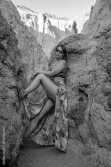 Beautiful girl in the mountains in a wasteland. Evening in the mountains. A girl in a dress. Pleasant summer evening.