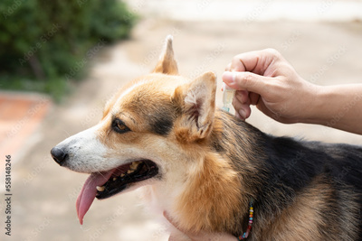 Close up woman applying tick and flea prevention treatment and medicine to her corgi dog or pet