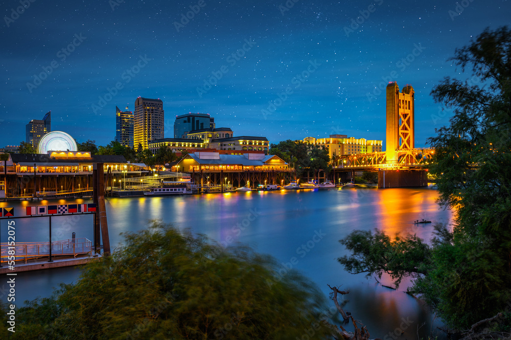 Tower Bridge and Sacramento River in Sacramento, California, captured at night