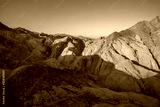 Beautiful stone mountains in the desert. Yellow sand on the mountains. Evening nature. Sunny summer day.