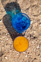 Beautiful cocktails on the sand near the sea shore. Glasses with summer cocktails. Yellow sand on the beach. Sunny summer day.