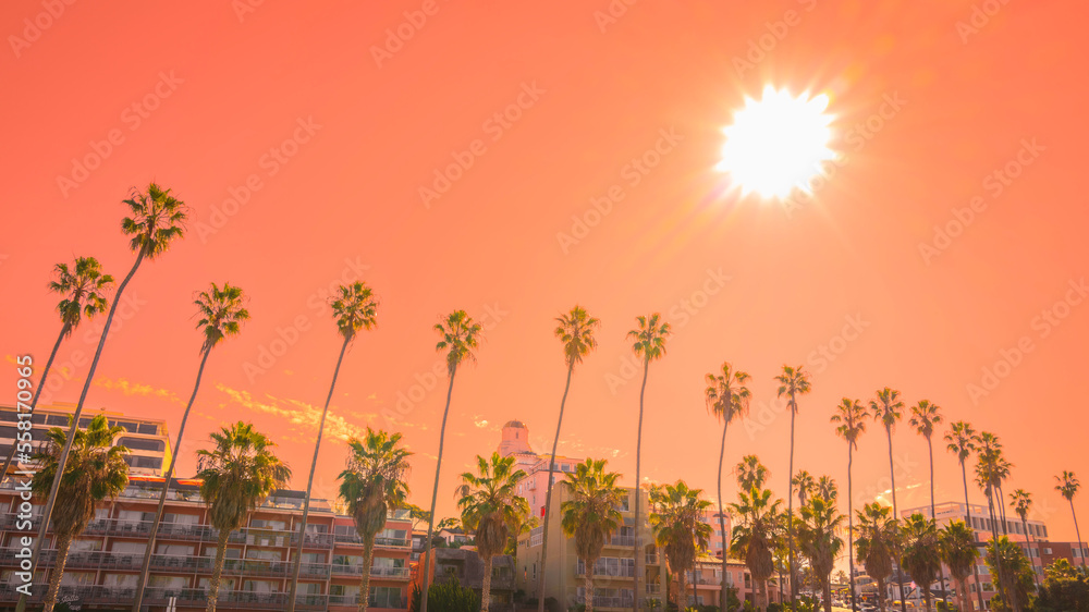La Jolla City Skyline, Tranquil sunset landscape with palm trees over the buildings in La Jolla, San Diego, Southern California, USA