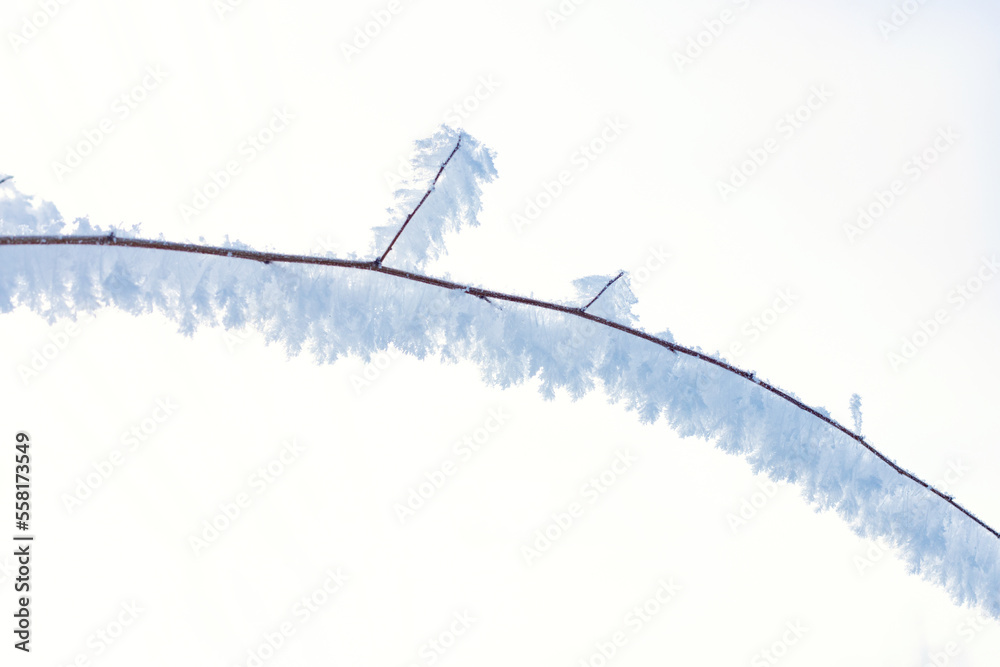 snow-covered branch, frost on a plant in winter,