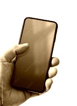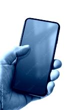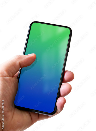 Hand holding a smartphone with blank blue and green screen. Isolated on white.