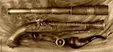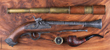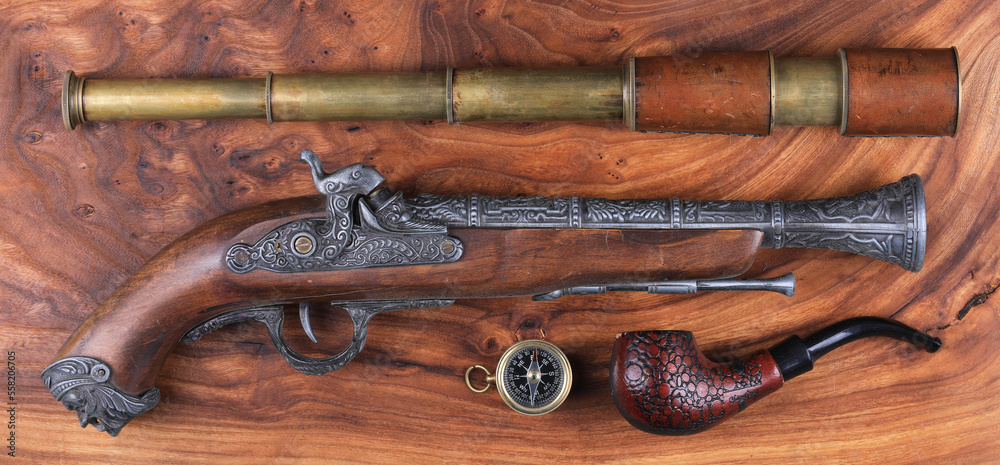 pirate pistol and spyglass on wooden background