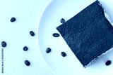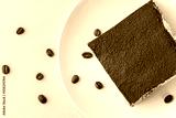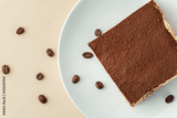 Tiramisu cake on white plate against beige background surrounded by coffee beans . Italian dessert made of savoiardi cookies filled with mascarpone cheese and sprinkled with cocoa powder. Flat lay