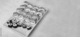 Sushi rolls set with salmon and shrimp on light blue background, Flower Shaped Sushi Rolls, Japanese cuisine, Copy Space