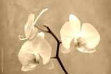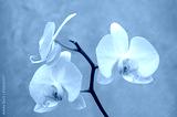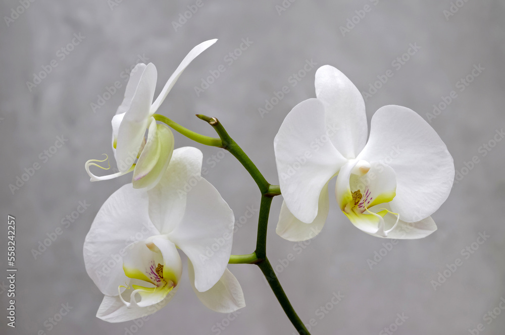white orchid, flowers on a branch on a gray marbled blurred background in close-up