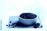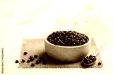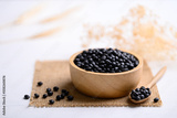 Black soybean seeds in bowl with spoon, food ingredients high protein good for vegetarian and vegan