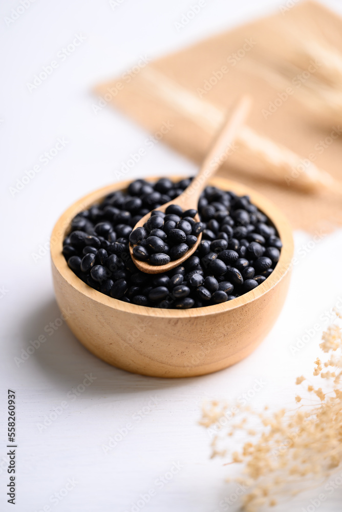 Black soybean seeds in bowl with spoon, food ingredients high protein good for vegetarian and vegan