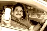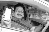 Happy indian mature man sitting in car wearing seat belt show blank smart phone display to put advertisement