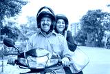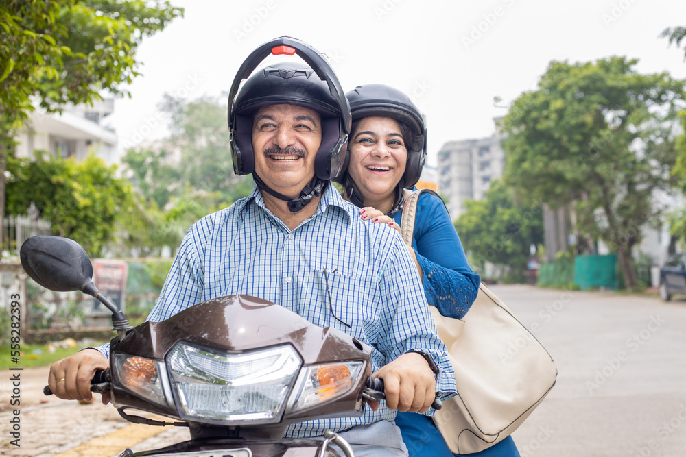 Happy mature indian couple wearing helmet riding motor scooter on road. Retirement life, Adventure and travel, Closeup