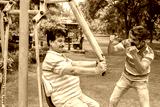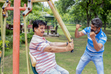 Indian mature senior men exercises on the public park gym equipment outdoor.