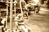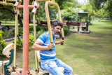 Indian senior grey bearded man exercises on the public park gym equipment outdoor.