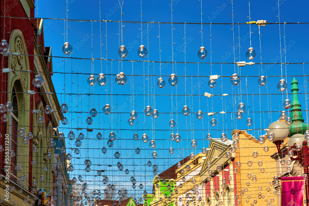Festive hanging garlands with light bulbs against the background of a blue sky.