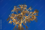 A tree decorated with festive garlands with luminous bulbs against the background of the night sky.