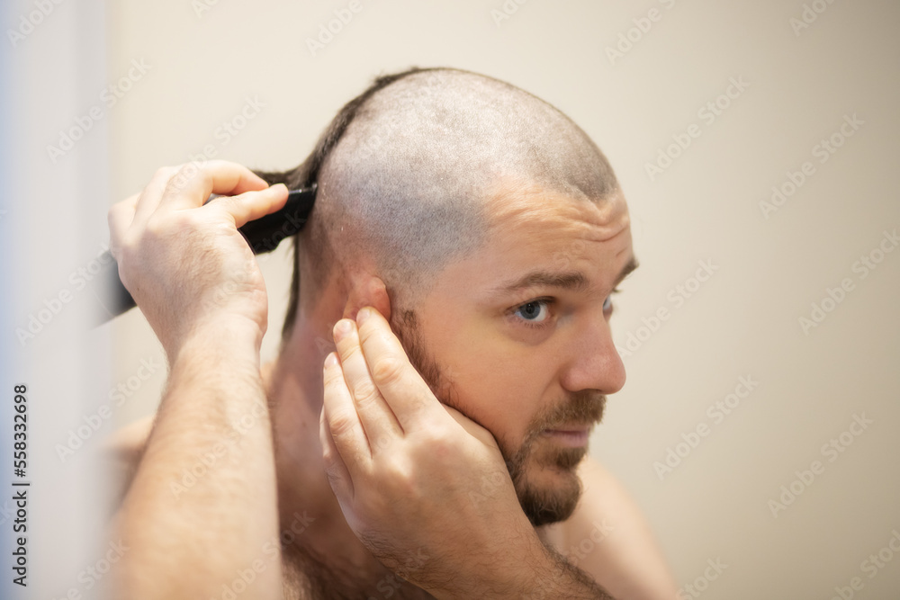 man cuts his head with a clipper in front of a mirror