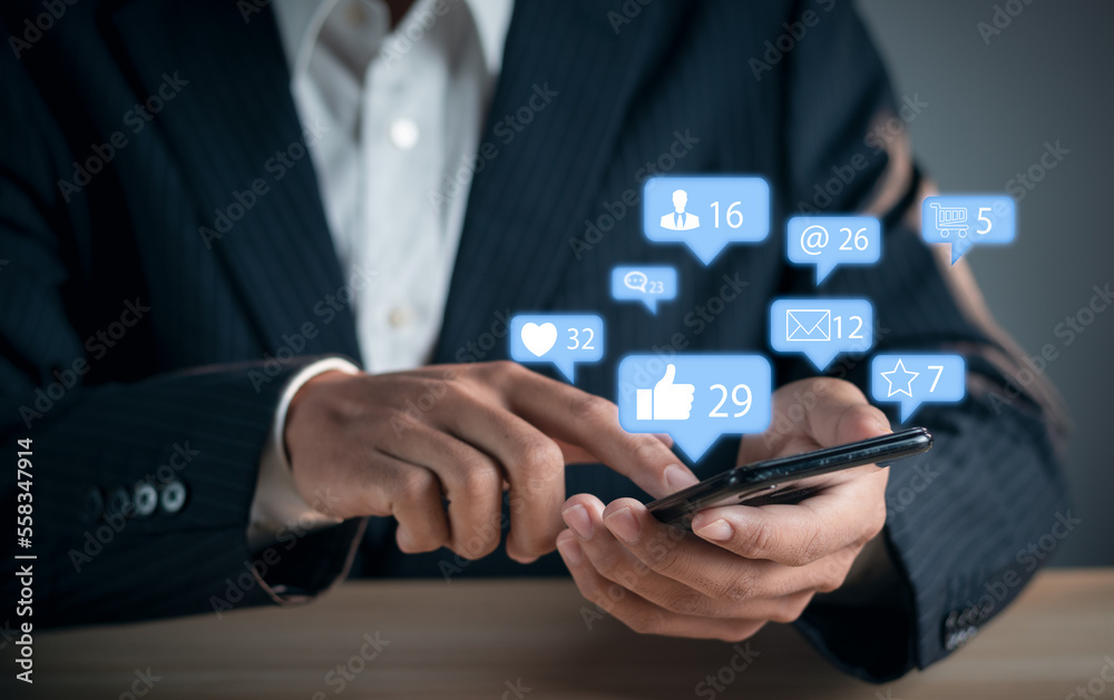 Social media marketing concept on mobile phone with notification icons of like, message, comment and star above smartphone screen.