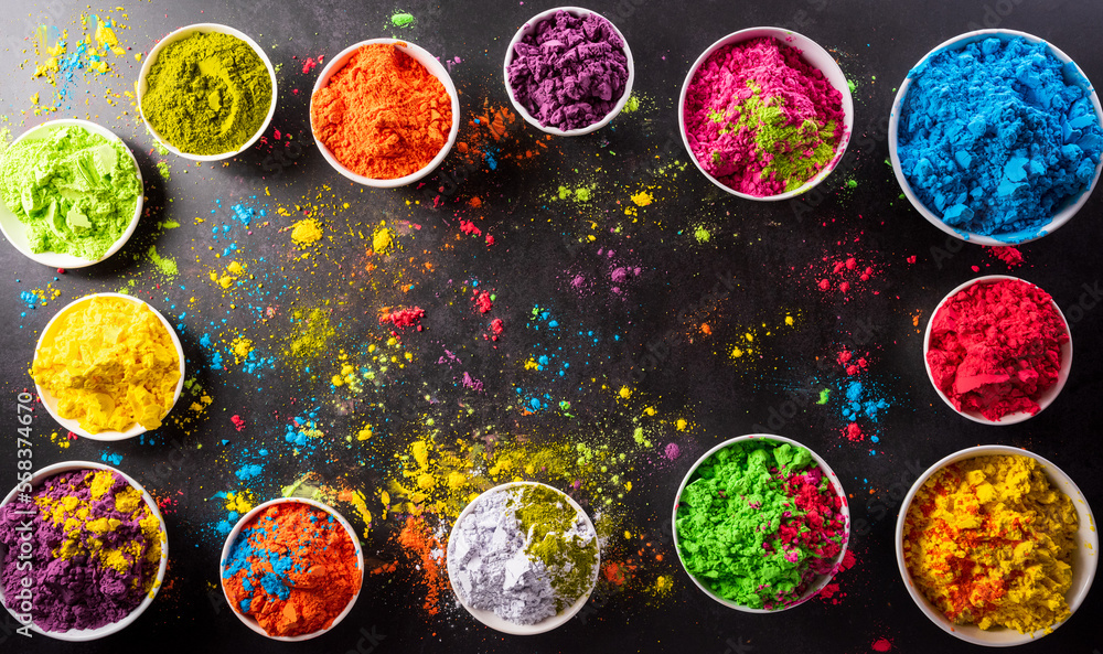 Top view of colorful holi powder with multicolored holi paint on dark background. Happy holi festival decoration concept.
