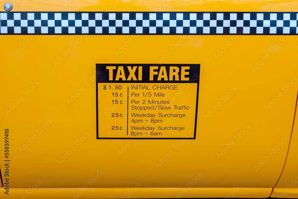 Taxi fares displayed on the side of a yellow cab in New York City in the1990s.