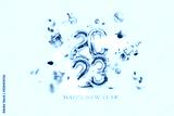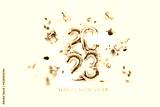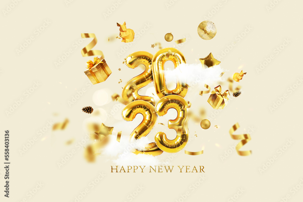 Gold Balloons 2023 fly with golden gifts, confetti, disco ball, bunnies and clouds fly on a beige background. Happy New Year 2023, a creative idea. Golden New Year luxury card