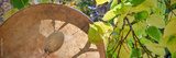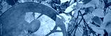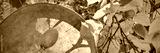 handmade, native American style, shaman frame drum covered by goat skin with a beater against fall foliage, web banner