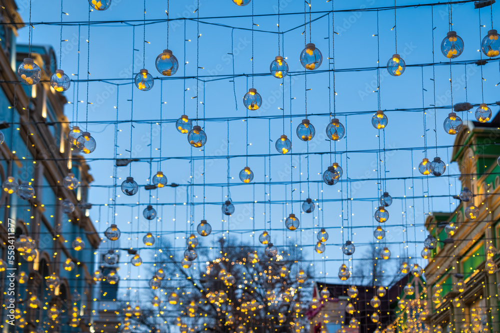 Festive hanging garlands with glowing light bulbs against the background of the night sky.