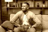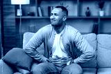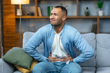 African american guy having stomach ache after eating touching aching stomach suffering from pain sitting on sofa at home. Food poisoning, gastritis, abdominal inflammation and appendicitis.