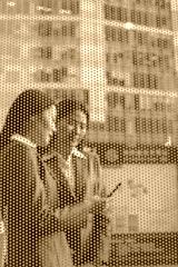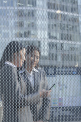 Two businesswomen looking at a phone