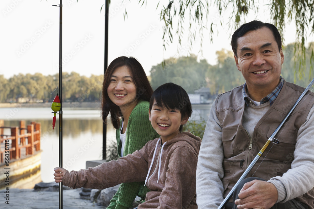 Family portrait with fishing gear at a lake