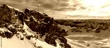 “Zugspitze“ panorama with summit cross is the hightest mountain peak in the bavarian alps in Germany. Wide angle winter panorama near Garmisch-Partenkirchen and Austria, black and white greyscale.