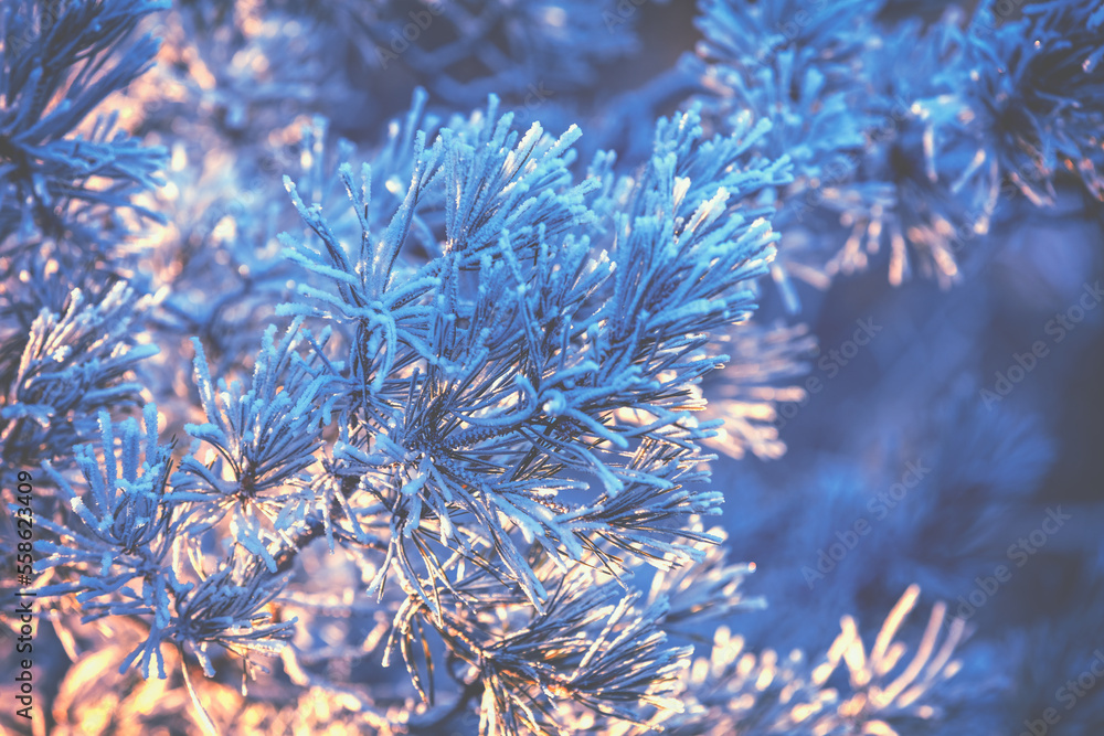 Pine branches covered with rime. Nature winter background. Winter nature. Snowy forest. Christmas background