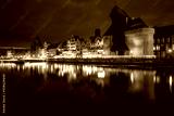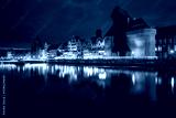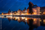 Old town in Gdansk with historical port crane over Motlawa river at night, Poland.