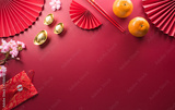 Chinese new year decorations made from red packet, orange and gold ingots or golden lump. Chinese characters on the object means to fortune, good luck, wealth, and money flow.