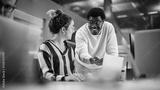Portrait of Two Creative Young Colleagues Consulting Eachother Using Laptop in Modern Office. Black Male Supervisor Discussing Scheduling with Female Hispanic Head of Operations..