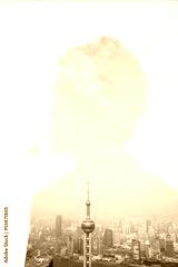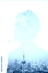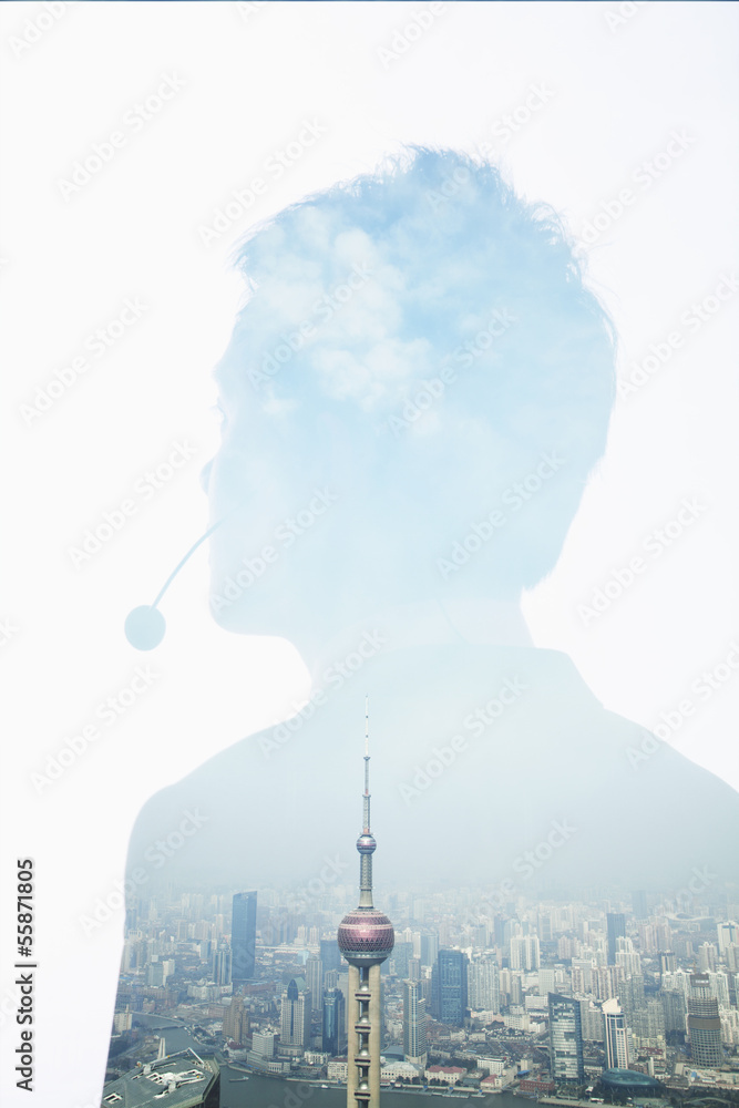 Double exposure of young businessman with headset and the skyline of Shanghai, China