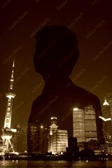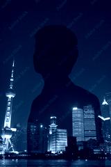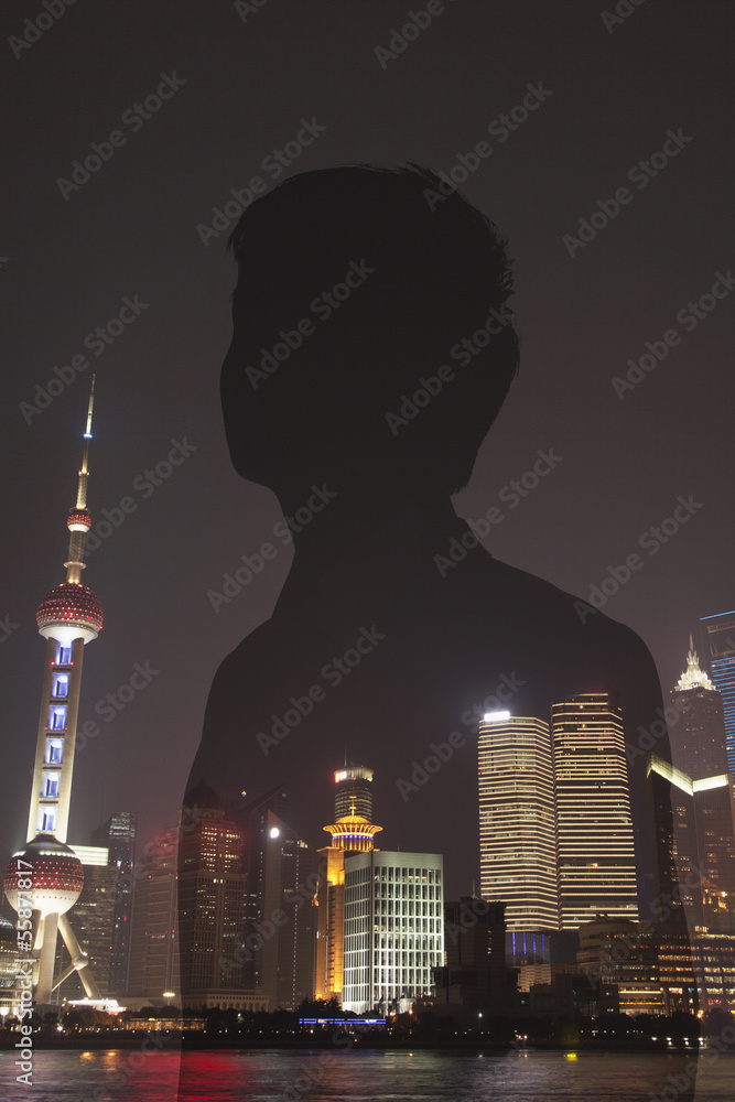 Double exposure of young businessman and the cityscape of Shanghai, China