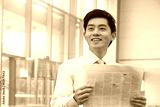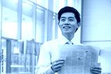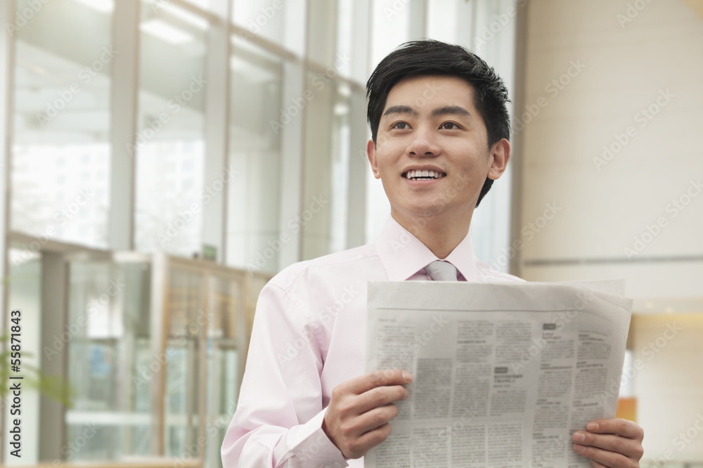 Young Businessman in pink button down shirt reading newspaper, Beijing, China