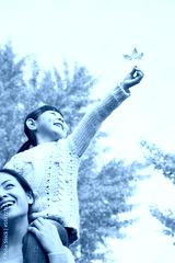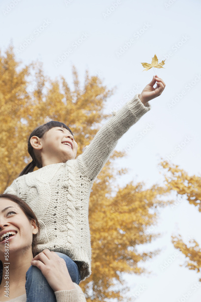 Daughter Riding Piggy-Back on Mother's Shoulders Enjoying Autumn Leaves