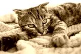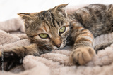 A domestic tabby cat with an unhealthy look lies on a soft blanket in the house. Sick pet close-up.